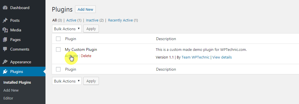 Now login to your Admin panel and navigate to “Appearance > Plugins”. You will see your newly uploaded plugin listed there. Hover your mouse on it and click on the “Activate” button.