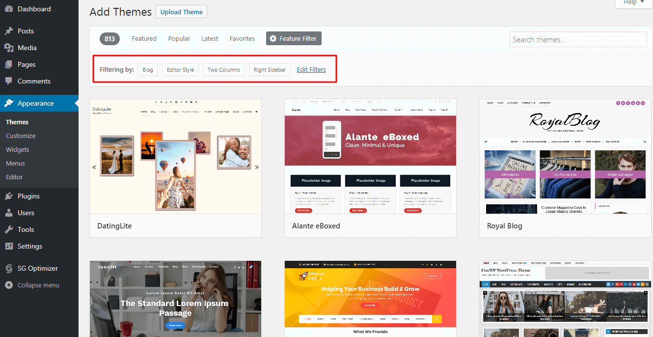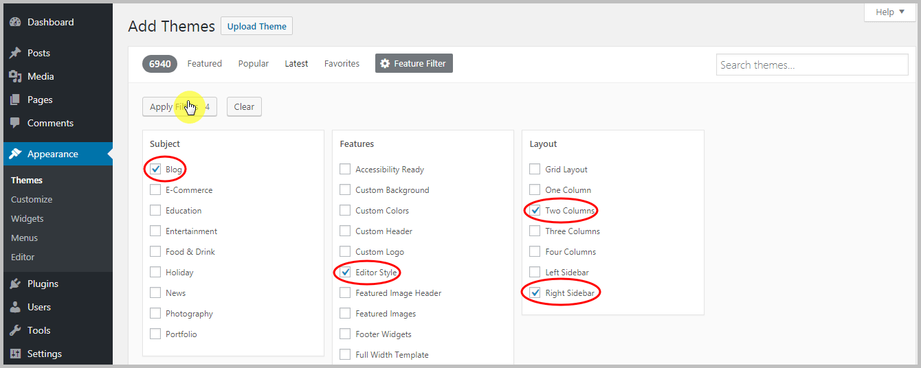Click on “Apply Filter”. WordPress will now show you all the themes that include your selected features.