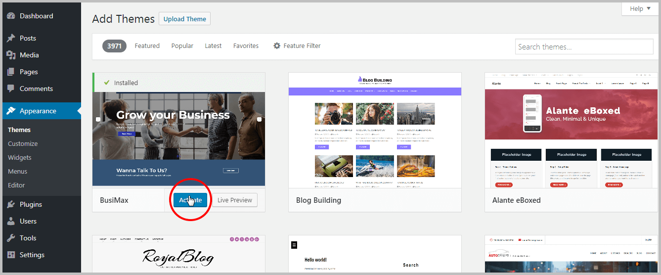 You are done with the FTP part. Now login to your Admin Panel and navigate to “Appearance > Themes”. You will see your newly uploaded theme listed there. Hover your mouse on it and click on the “Activate” button.