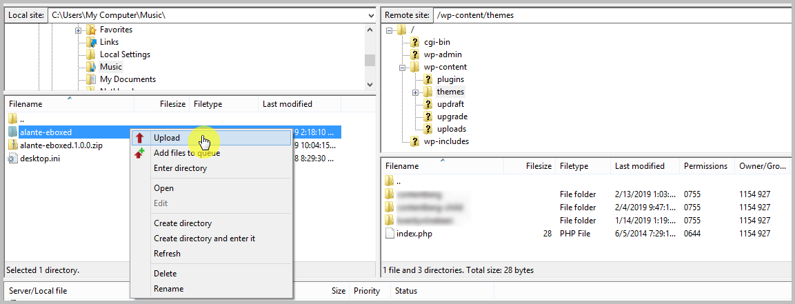 Now that you have learned how to connect FTP client to your hosting, upload the theme folder on /wp-content/themes/ directory of your hosting.
